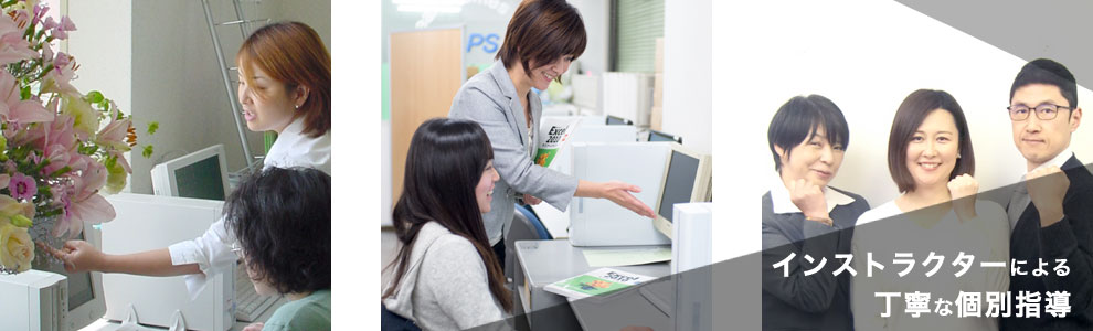 インストラクターによる丁寧な個別指導 ラップスパソコンスクールは、インストラクターによる丁寧な1対1の個別対応です。 近年よくありがちないわゆる「DVD・ビデオ学習」とは、一切異なり、インストラクターが生徒ひとりひとりの状態を把握した最適な指導を行います。